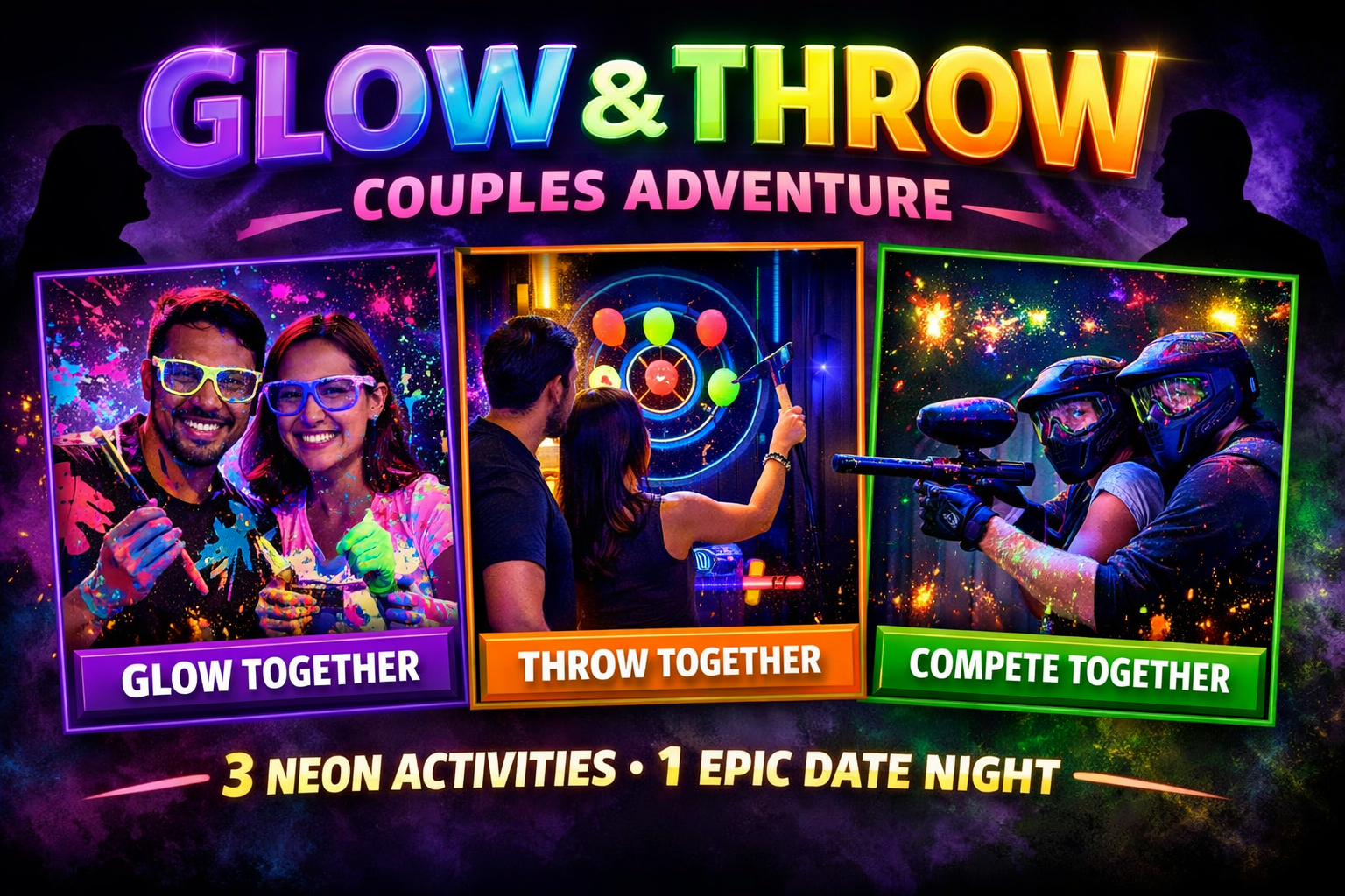 The Glow & Throw Couples Adventure is the ultimate high-energy neon date night for couples who want something way more exciting than dinner and a movie. Step into glowing blacklight arenas where youβll throw axes at neon balloon targets, splash glowing paint, and blast paintball targets together.
