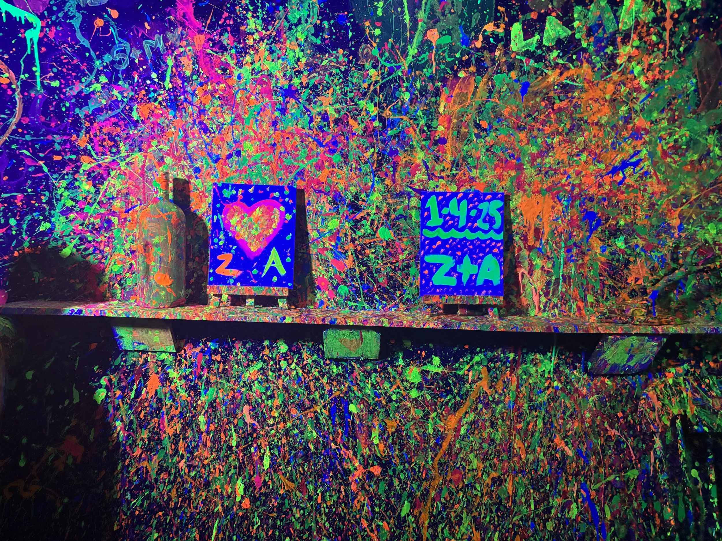 Enter our UV splatter room where the paint glows and creativity explodes.