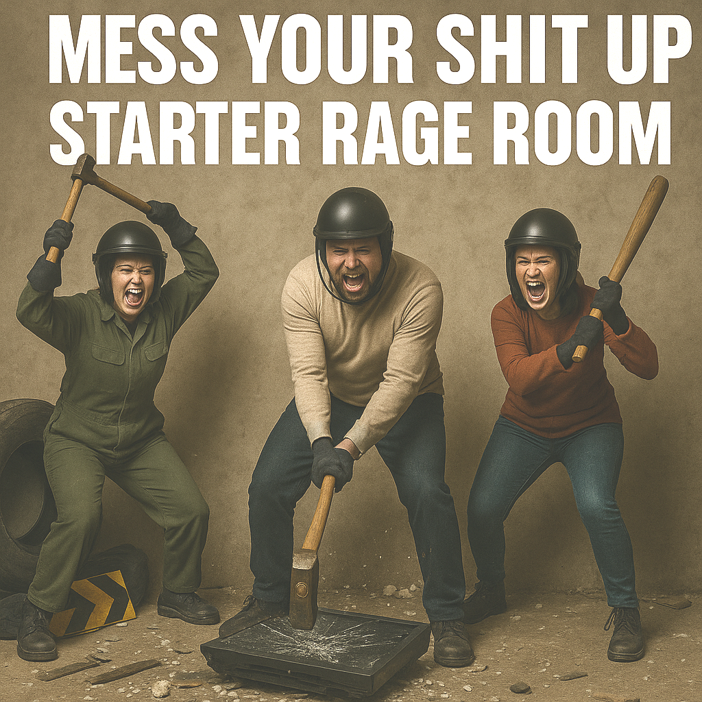 Feeling stressed? Got built‑up rage? Come let it all out with our Mess Your Sh!t Up Starter Pack! This 25‑minute rage‑room experience is packed with glass, furniture, industrial junk — and your own private arsenal of destruction. It’s messy. It’s loud. It’s cathartic as hell.