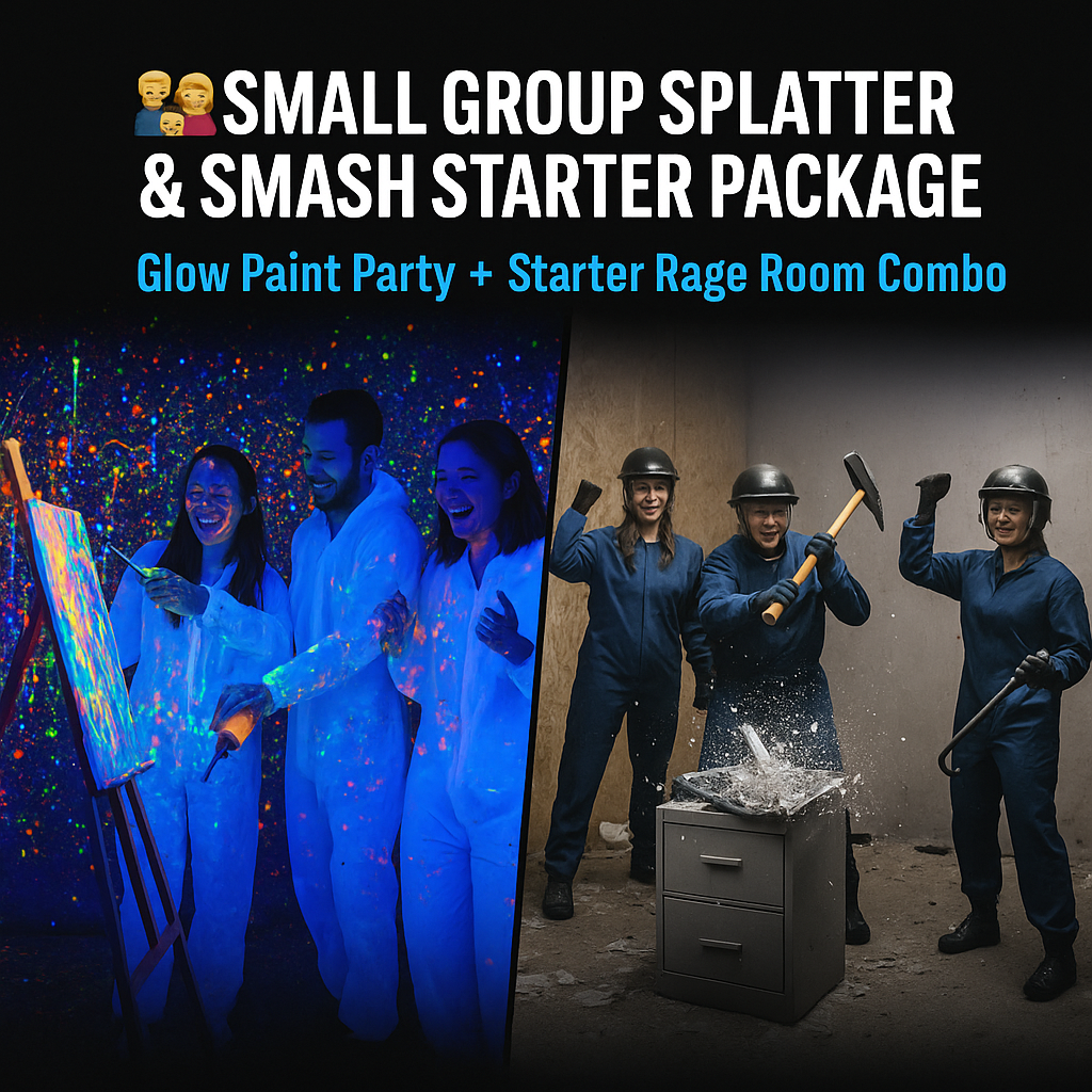 Perfect for double dates, mini celebrations, small friend groups, or anyone who wants glowing fun AND smashing chaos — all in one private experience. No sharing. No awkward vibes. Just pure freedom to paint, destroy, and laugh your asses off.